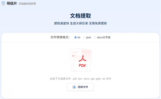 基于这个常见问题,作者推出一款免费的文档提取服务。主要功能支持pdf、doc、docx、ppt、pptx、txt的段落,内容的大纲提取。还支持PDF转换文字格式的docx。